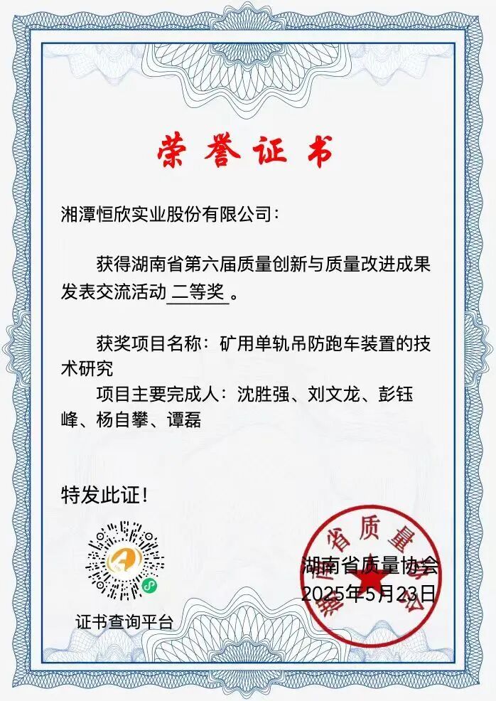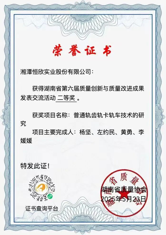 公司質量管理工作亦在省級平臺上獲得高度認可。在湖南省質量協(xié)會第46次優(yōu)秀質量管理小組表彰大會上,【恒欣股份】榮獲“湖南省第六屆質量創(chuàng)新與質量改進成果”二等獎兩項,有軌QC小組獲“湖南省第46次QC小組成果二等獎”,充分體現(xiàn)了公司在質量創(chuàng)新與實踐方面的綜合實力。