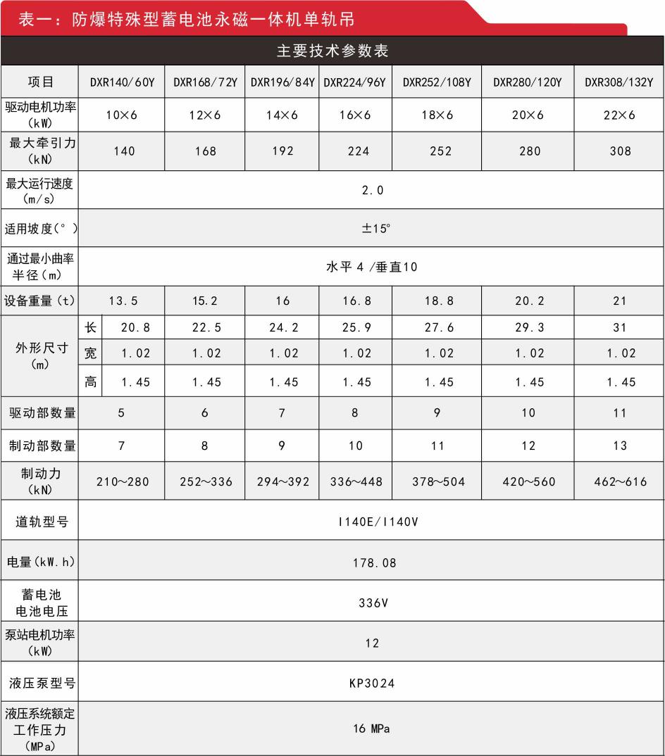五、防爆特殊型蓄電池單軌吊技術(shù)參數(shù)
