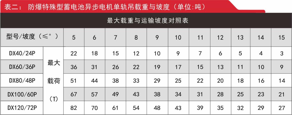 2.防爆特殊型蓄電池異步電機(jī)單軌吊參數(shù)及負(fù)載表
