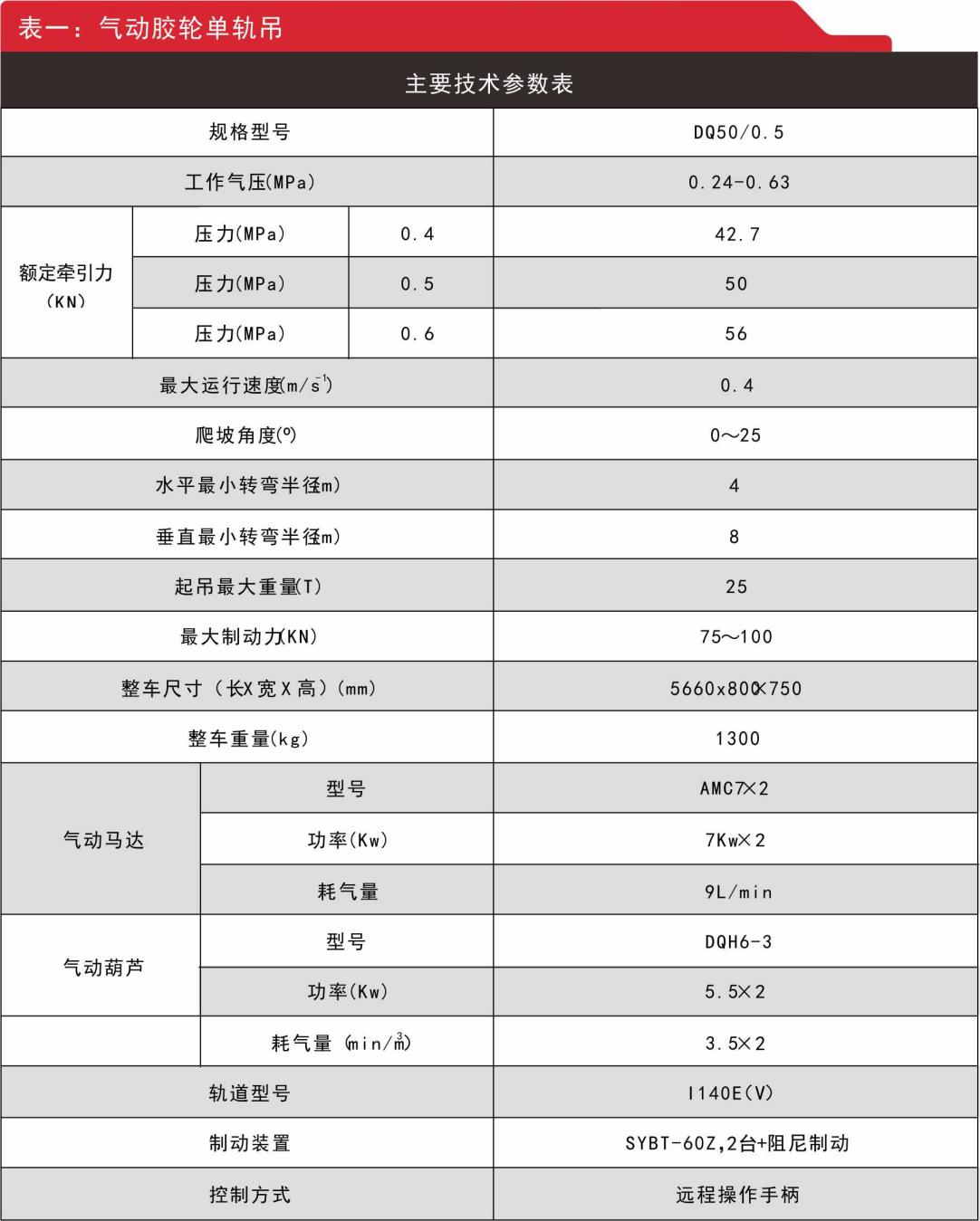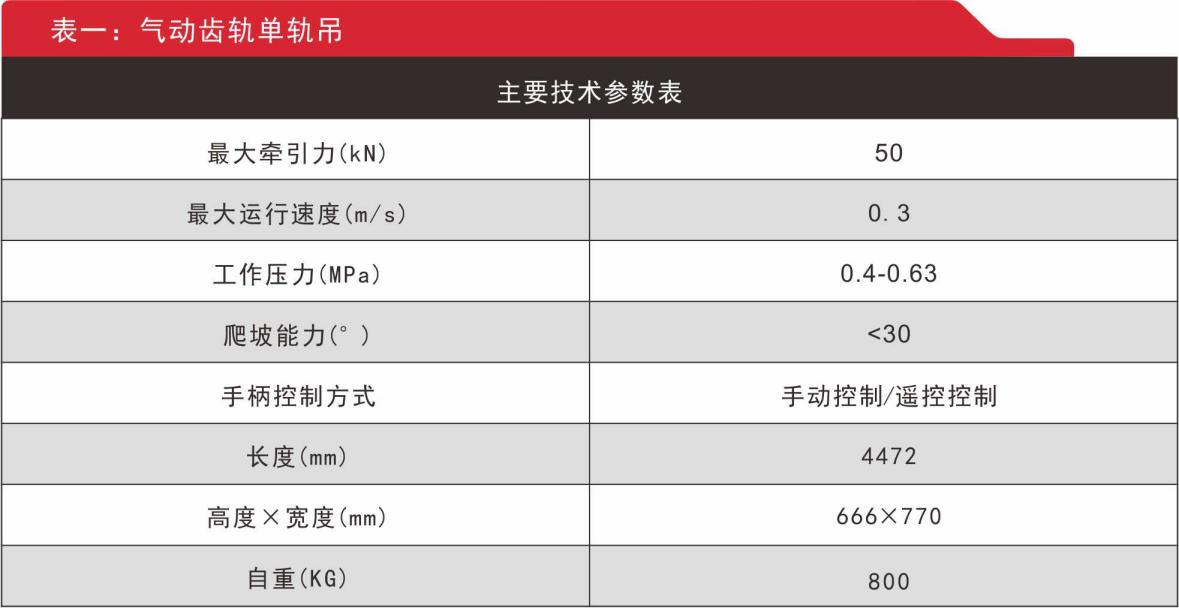 1.氣動膠輪單軌吊參數(shù)及負(fù)載表