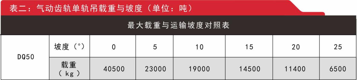 2.氣動齒軌單軌吊參數(shù)及負(fù)載表